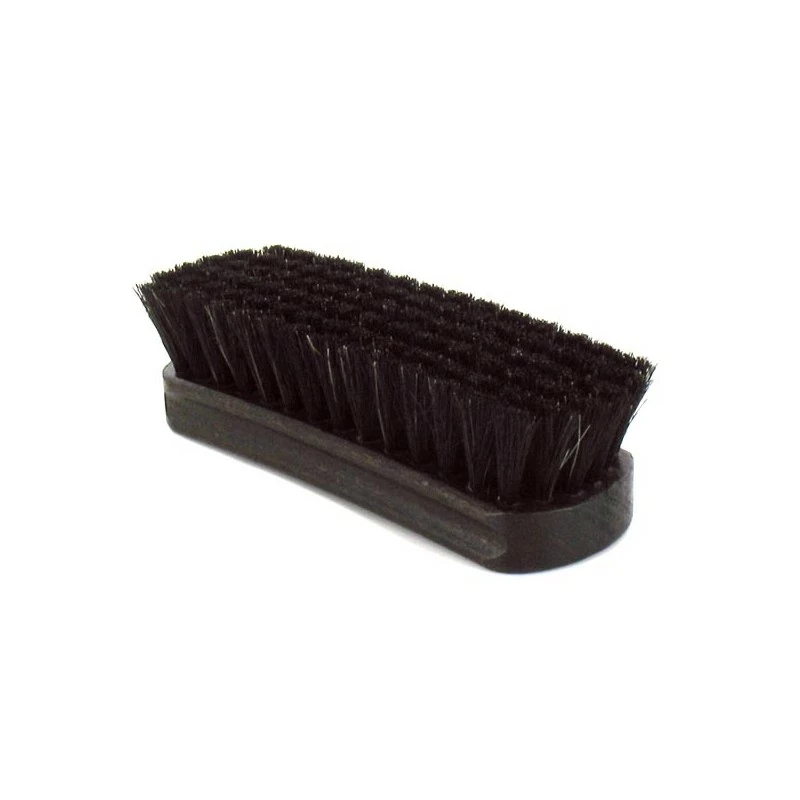 Une brosse à reluire FAMACO de petite taille, à poils noirs, pour donner de la brillance au cuir après l’application du cirage.
