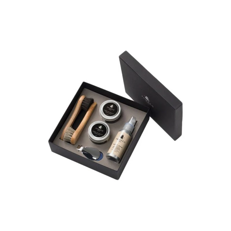 Grand coffret à offrir de la marque FAMACO ou idéal pour vous accompagner lors de vos déplacements ! Ce coffret contient tout le nécessaire pour l’entretien de vos chaussures noires ou de couleur : 2 pommadiers, 2 brosses, 1 mini chausse-pied, 1 chamoisine et un Raviv Daim.