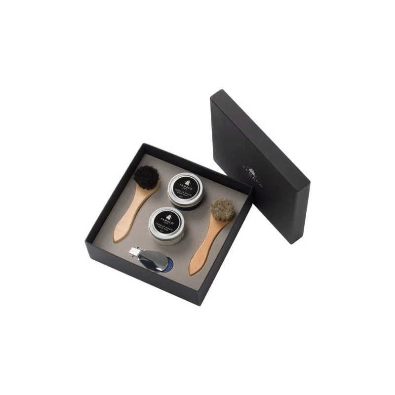 Petit coffret FAMACO à offrir ou idéal pour vous accompagner lors de vos déplacements ! Contient tout le nécessaire pour l’entretien de vos chaussures noires ou de couleur.
