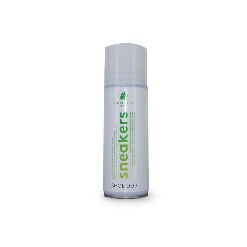 Produit d’entretien pour chaussures de la marque FAMACO que vous utiliserez facilement pour rafraîchir et neutraliser les mauvaises odeurs.